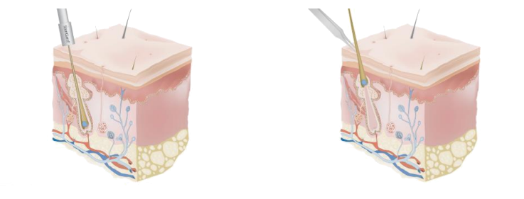 Un micro-filament à usage unique est inséré dans le follicule pileux pour délivrer une micro-impulsion afin de détruire les cellules germinatives responsables de la repousse du poil.